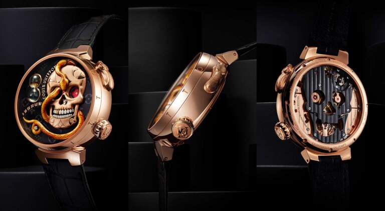 The Tambour Carpe Diem includes additional watch complications as well: a jumping hour, a retrograde minute, a power reserve display and the mechanism of the automata. The LV 525 caliber was entirely developed and assembled at La Fabrique du Temps Louis Vuitton, and is currently the subject of several patent applications. Assembled in the shape of a skull, the caliber is visible on the back of this exceptional timepiece. Louis Vuitton called on artisans Anita Porchet for the enameling and Dick Steenman for the engraving, applying meticulous savoir-faire to create an audacious contemporary aesthetic.