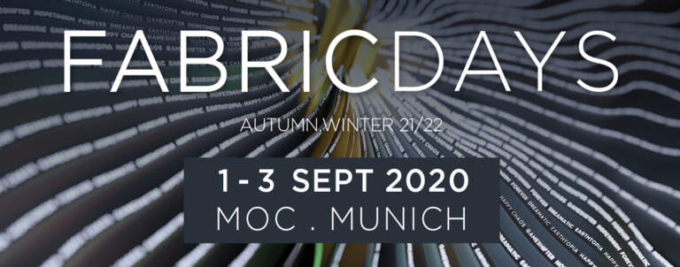 FABRIC DAYS will take place from 1 – 3 September 2020 at the MOC in Munich. In the four fully booked halls on the ground floor of the MOC, around 300 German and European exhibitors will present their new developments in 5 segments for Autumn.Winter 21/22 in around 700 collections. Among the list of confirmed international exhibitors are many high quality premium suppliers, who will showcase a broad product range.
