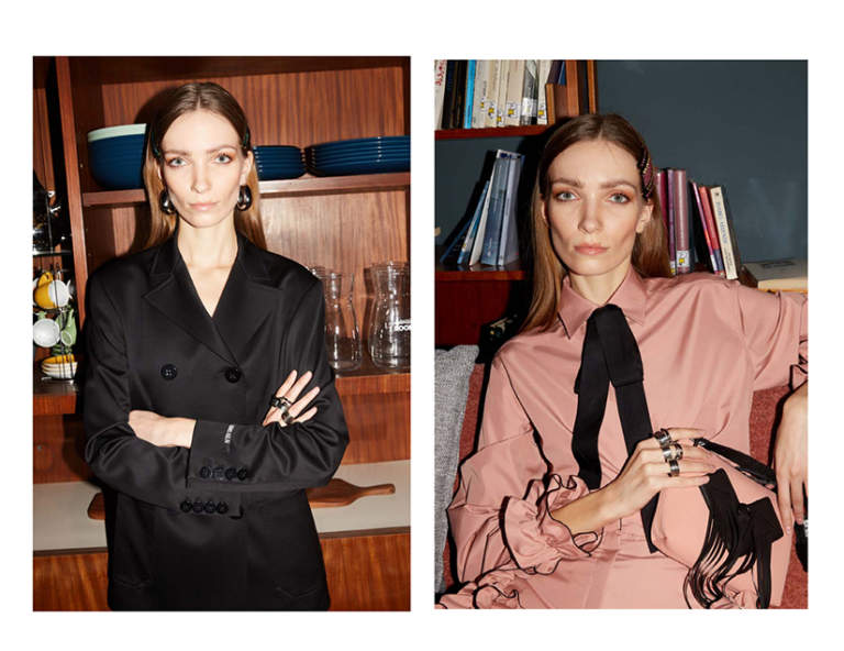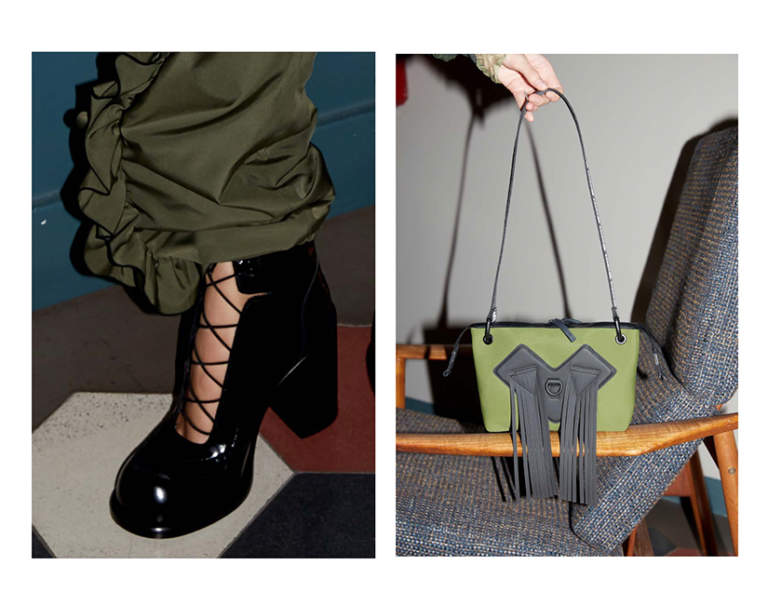 The t-shirts by Kharis Aglai, made of transparent pleated organza, give a romantic allure to the entire collection. The choice of the color palette is oriented towards the color blocks, one of the main signa- tures of KHARIS AGLAI, which we find in the suits with oversized double-breasted blazers and in tailored skinny pants. From the pitch black of the outerwear garments, through the shocking pink of the stretch wool suit, toward skin tones to soften and create balance, up to a classy army green that we find in the corset, which KHARIS AGLAI brings back into vogue in a contemporary key. The corset lacing is re-proposed in 90’s leather ankle boots.