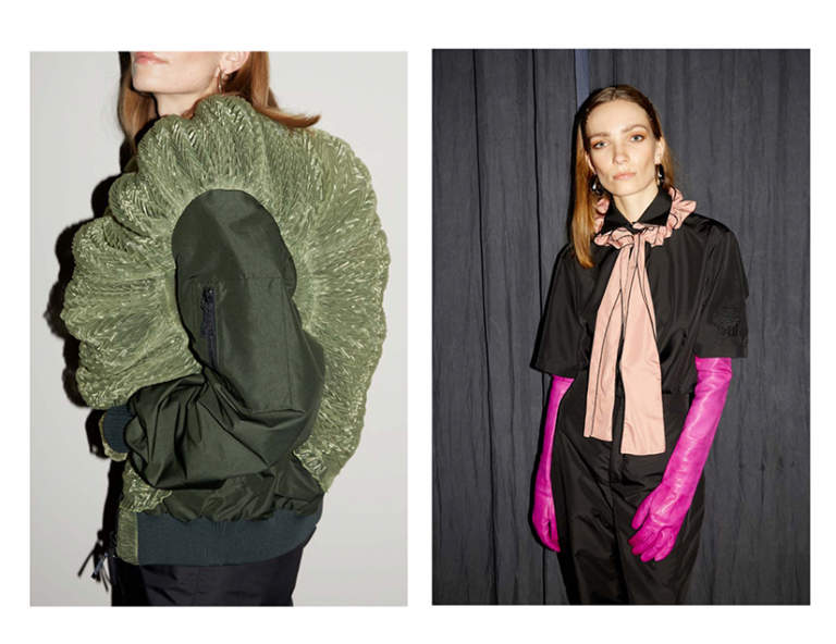The attention paid to everyday life and its moments is explicitly stated by the choice of the development of experimental outerwear: plissé bombers, with a sculpted volume and irreverent character, contrast with the oversized down jacket with adjustable drawstring, original and easy to combine.