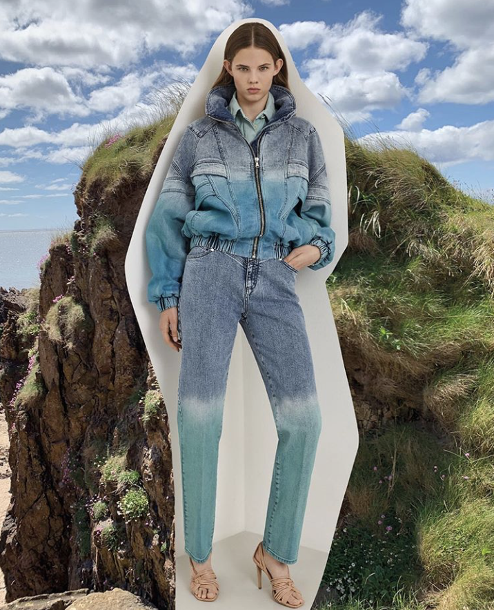The fashion industry as a whole has been addressing the issue of how large of a carbon footprint the fashion industry leaves. Many brands are working to manufacture and create their pieces in a more environment friendly way. McCartney utilizes the Coreva Stretch Technology along with using plant-based yarns to create her biodegradable denim.