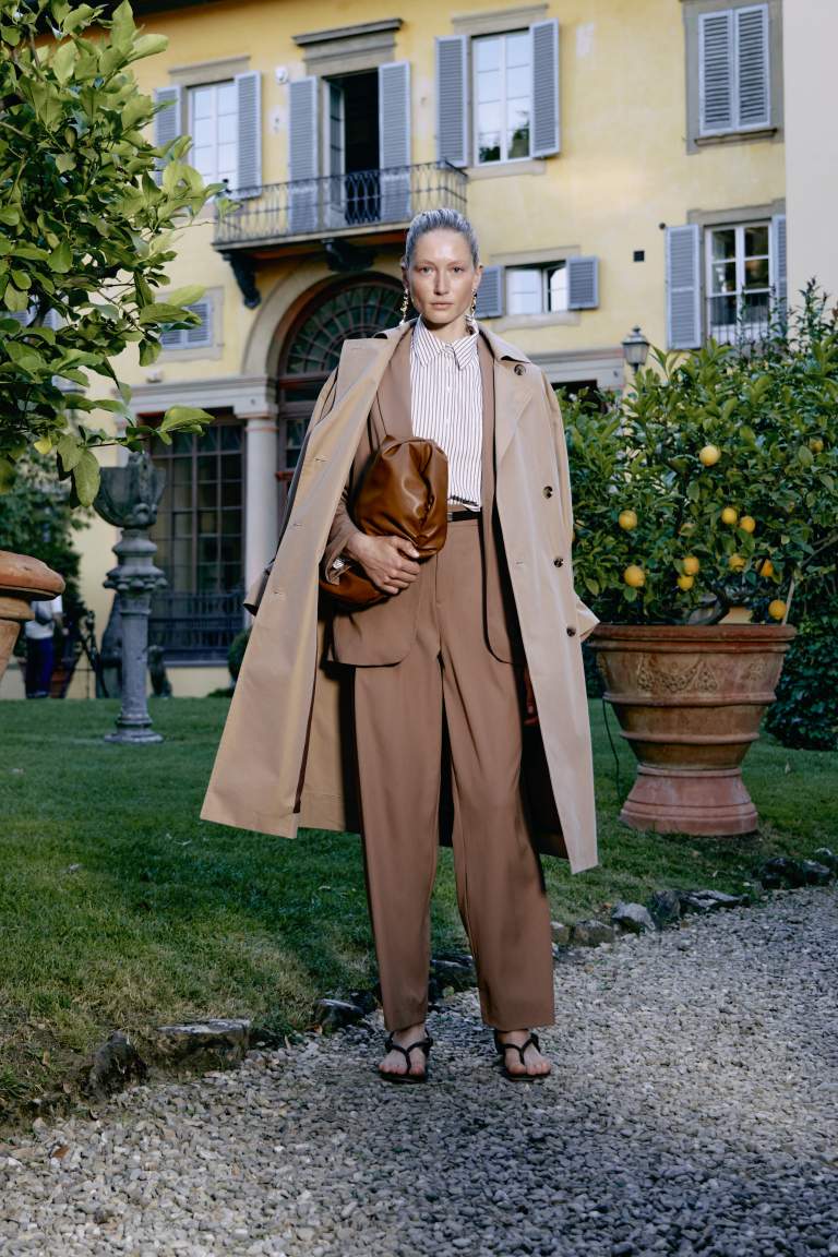 The womenswear dominated with a diverse color palette of blues, off-whites, vanilla, cognac, camel, and beige, harmoniously interacting with sky blue. Contrasts were set with white and black. Wide trousers paired with short blouses, soft knitwear in cardigans, dresses, and sweaters were combined with shirt dresses. Materials such as bouclé, summer wool, and neoprene were interestingly interpreted, while trench coats and quilted textures elegantly and stylishly blended into the casual look. Boxy jackets and prints added additional accents.