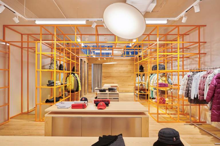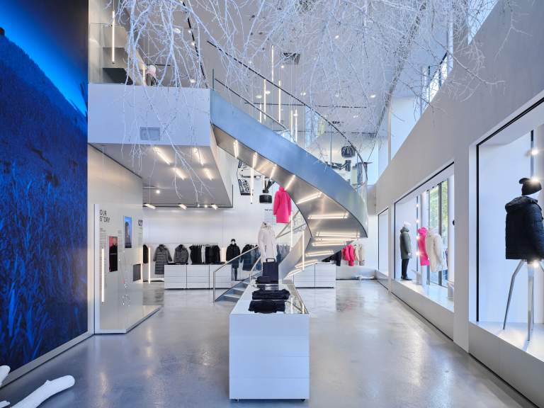 In addition to the current product highlights for men and women, there are various elements in the Experience Area on the ground floor that invite visitors to explore the world of the brand. The two core competencies of the brand are reflected in a knit and a parka installation.