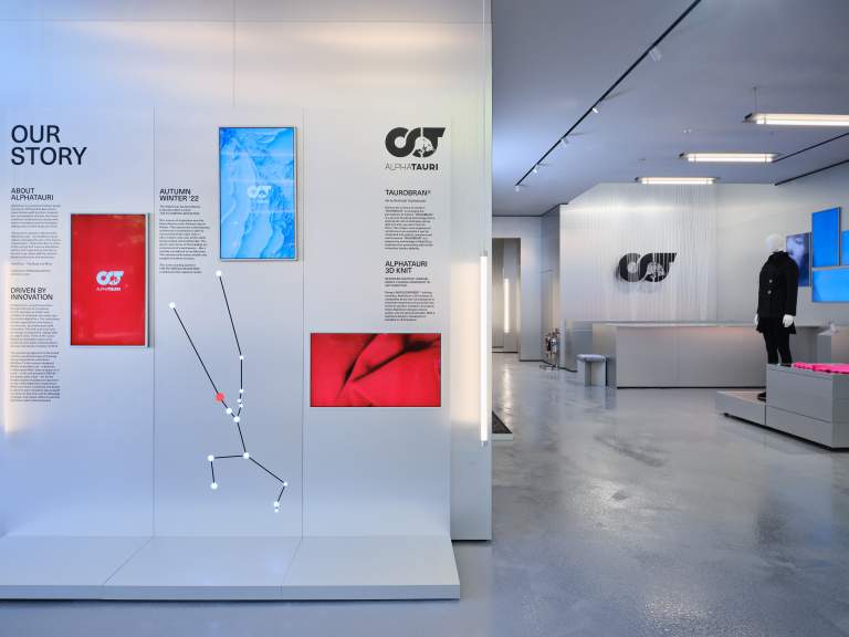 With a slick monochrome interior made of brushed aluminum – interspersed with natural materials and specially designed lights, the store aesthetic is an authentic homage to the design language of AlphaTauri. The combination of technical and natural elements combined with the interaction of digital, innovative and interactive elements creates a unique shopping experience and delivers an outstanding concept that focuses on the customer.
