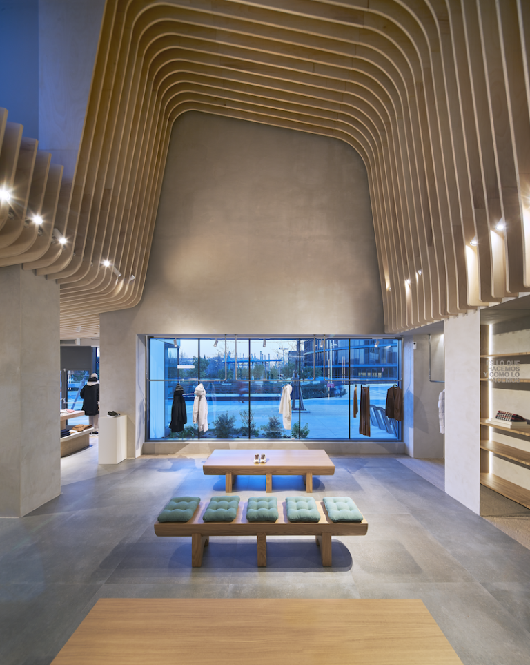 The key criteria for the materials used was having a positive CO2 impact, recycled content, and the ability to be reutilized and recycled at the end of their lifecycles. Wood beams, sourced locally from Spanish forests wave across the 149 m2 space, a material with a positive CO2 impact, as trees actively absorb CO2 from the atmosphere during their lifecycles. The furniture is made with an oak wood and then covered with a natural raffia while the tall tables have an insert fitted with white clay tiles. 100% Recycled polyester fabrics that give a second life to recycled plastic bottles are used to upholster the cushions, furniture, and serve as the drapery for the dressing room. The walls are covered with terracotta, a material that naturally regulates heat and humidity lowering the store’s energy consumption.