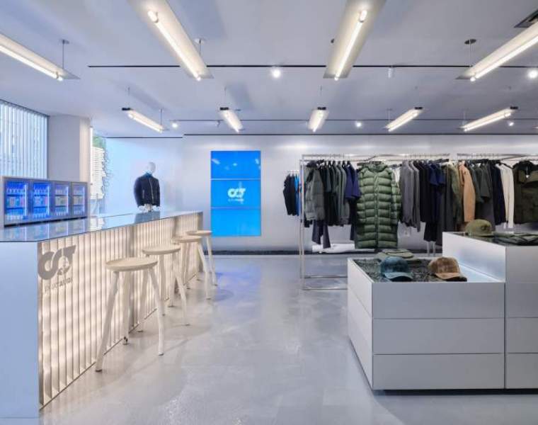 In addition to the current product highlights for men and women, there are various elements in the Experience Area on the ground floor that invite visitors to explore the world of the brand. The two core competencies of the brand are reflected in a knit and a parka installation.